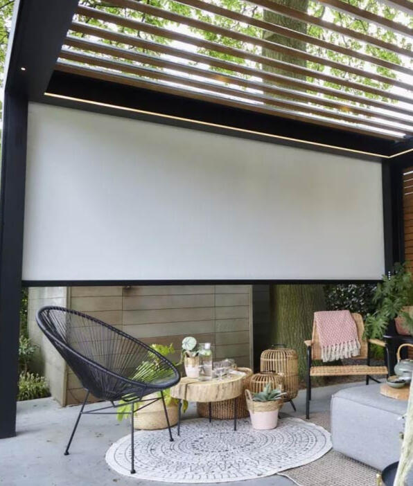 La Pergola à toile enroulable Z!P se caractérise par son toit incliné et ses gouttières discrètement intégrées dans les poteaux. Savourez pleinement votre espace extérieur à l'abri.